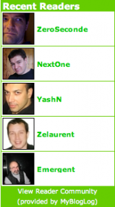 Vous savez, MyBloLog, c’est ce service web qui permet d’afficher les visages et les noms de ceux qui visitent un site (pourvu que l’on se soit inscrit auparavant). Vous en avez un exemple sur la page d’accueil de Zéro Seconde (à droite, en bas, encore plus bas, oui, là).