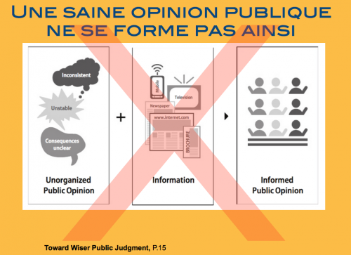 Il ne suffit pas de mettre en présence un public et de l’information (aussi vulgarisée soit-elle) pour qu’une opinion sensée en sortira automatiquement.