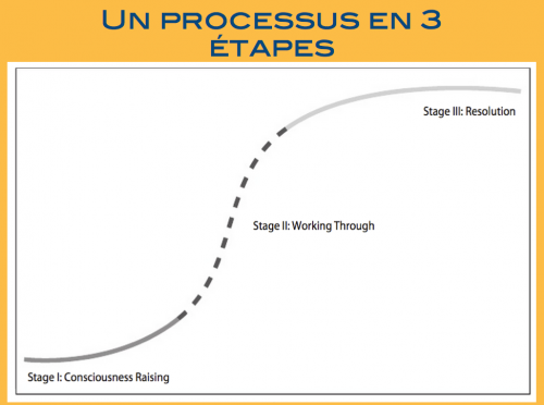 La première étape est ce à quoi on peut s’attendre: il y a une prise de connaissance des enjeux. Mais ensuite il doit y avoir des sessions où chacun pèse le pour et le contre pour arriver à prendre la dure décision, à la troisième étape, mais cette fois-ci libérés des sentiments et des commentaires non constructifs.