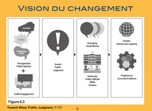 Dans le récent livre de Yankelovitch «Toward a Wiser Public Judgement» il explique sa vision sur la façon que doit se former une opinion publique éclairée.