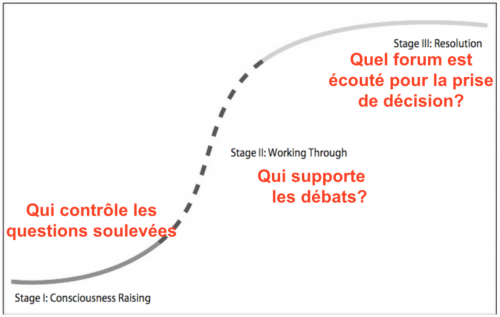 Un gouvernement qui ne se préoccupe pas aujourd’hui de comprendre comment organiser ces espaces (stage 2, «Working through») risque de voir lui éclater à la figure toute sorte de groupes de pression qui se seront eux-mêmes formés leur propre opinion dans leur silo respectif et ne comprendront pas pourquoi, «en haut», on ne prend pas leurs conclusions auxquels ils sont arrivés comme la parole du bon sens.